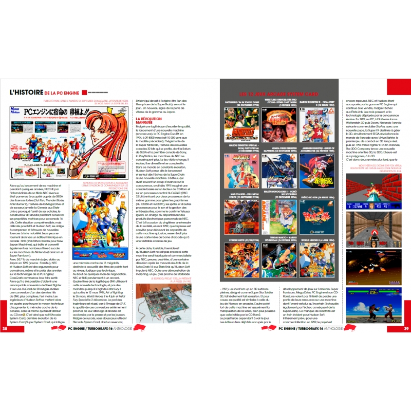 Écrit par J’m Destroy et Renaud Lucot, l’Anthologie PC Engine/Turbografx-16 & PC-FX retrace sur plus de 350 pages cette épopée fantastique. Elle regroupe l’ensemble de la logithèque japonaise et américaine sur HuCard, CD-Rom en passant en revue le catalogue si particulier et riche de la PC-FX. Cette Anthologie retrace également la VÉRITABLE épopée française des machines de NEC.